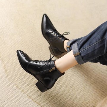復古顯瘦尖頭粗跟小短靴女秋冬新款系帶馬丁靴真皮及踝靴中跟短靴