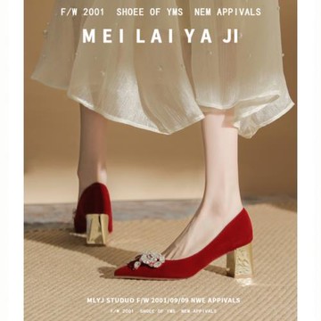 意美絲水鉆方扣紅色婚鞋女2025新款緞面法式高跟鞋粗跟秀禾新娘鞋