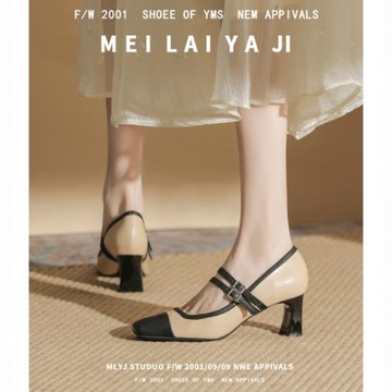 意美絲拼色瑪麗珍高跟鞋女春秋新款方頭粗跟一字帶單鞋設計感小眾