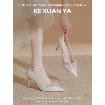 【可軒雅】珍珠白色婚鞋主婚紗法式尖頭細跟緞面絕美高跟鞋女新款