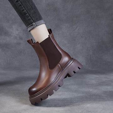 春秋車縫線后拉鏈棕色馬丁靴粗跟彈力瘦瘦靴厚底短靴女圓頭時裝靴