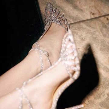 小眾高跟鞋2025春季新款網紅交叉一字帶水鉆尖頭鏤空歐美高跟涼鞋