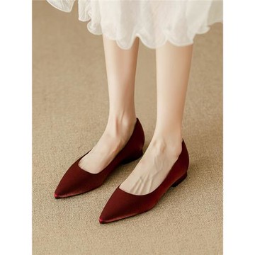 法式尖頭平底單鞋女綢緞伴娘鞋秀禾婚鞋不累腳一腳蹬低跟淺口女鞋