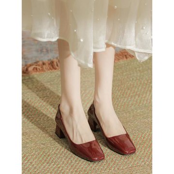 百搭粗跟漆皮黑色高跟鞋女職業2025新款日常方頭淺口軟皮單鞋女夏