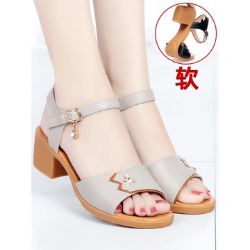 真皮涼鞋女夏季新款中跟粗跟女鞋百搭中年大碼軟底媽媽鞋皮涼鞋子
