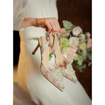 法式婚鞋新娘鞋主婚紗珍珠單鞋小眾后空高跟鞋女細跟中空包頭涼鞋