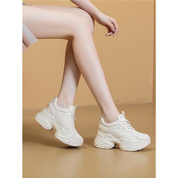 2025新款真皮超高跟12cm內增高老爹鞋女運動風時尚單鞋白色松糕鞋