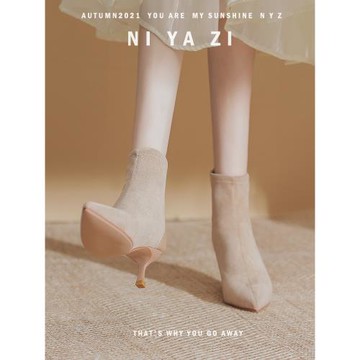 裸色絨面短靴女細跟拼接秋冬季后拉鏈靴子尖頭單靴配裙加絨高跟鞋