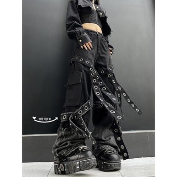 美式朋克重工綁帶牛仔暗黑女街舞飄帶解構工裝街頭輕亞闊腿暗黑風