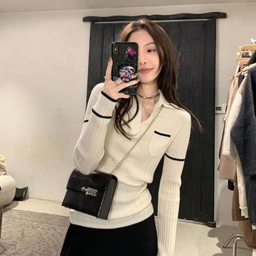 白色polo領打底針織衫女秋冬小香風內搭小眾獨特別致坑條長袖上衣