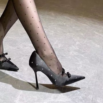早春新款設計感波點水鉆蝴蝶結性感高跟鞋女細跟小方頭淺口單鞋女