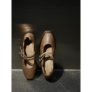 LOU SHOYER單鞋女水洗馬皮復古雙扣帶內增高芭蕾淺口方頭瑪麗珍鞋