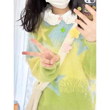 學院風復古2024新款小個子穿搭軟糯馬海毛撞色星星針織衫毛衣女秋