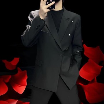 輕奢歐美高街風痞帥純黑西裝男女潮流金屬扣修身設計感男士小西服