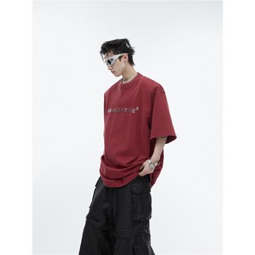 美式男女夏季小眾細閃設計感墊肩短袖T恤金屬印花點綴圓領厚實上