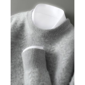 圓領加厚山羊絨長袖套頭男士毛衣寬松扭花商務內搭羊毛針織衫打底