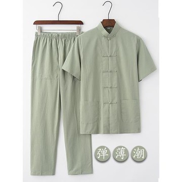 新款夏季薄款棉麻唐裝男短袖套裝中老年男士太極服禪服茶服居士服
