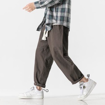 日系男裝2023春裝新款休閑百搭純色抽繩直筒褲男士寬松日系工裝褲