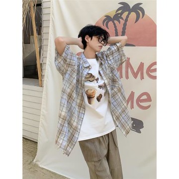 白口陽【伯明翰來信】薄款三色毛邊格子短袖襯衫休閑寬松百搭襯衣