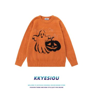 KKyesiou萬圣節趣味南瓜幽靈針織衫男女氛圍感橙色設計感情侶毛衣