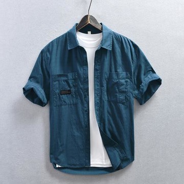 夏季新款短袖襯衫男士夏季純棉工裝美式休閑薄款純色寬松襯衣外套