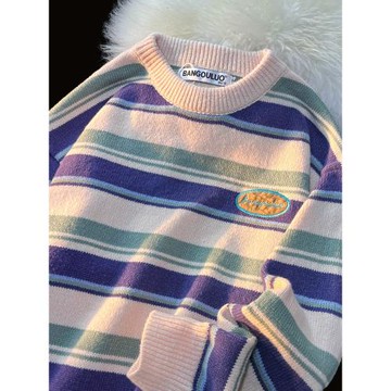WHXS潮牌復古撞色條紋圓領針織衫毛衣男寬松情侶百搭套頭毛衣