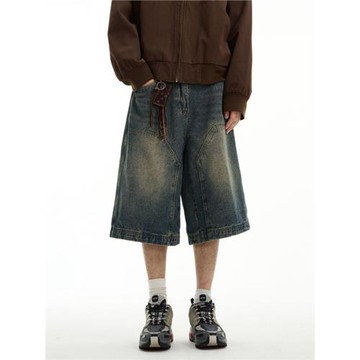 點我下載美式高街復古水洗牛仔短褲男夏季歐美情侶潮牌直筒寬松闊腿七分褲