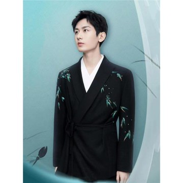 成毅明星同款西服中國風黑色竹葉落雪刺繡西裝休閑設計感綁帶上衣