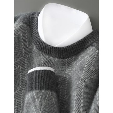 秋冬新款雙股加厚100%純羊毛衫男士圓領提花撞色商務休閑時尚毛衣