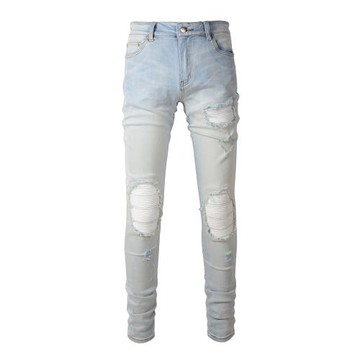 歐美高街潮牌AMR新款淺色補丁破洞牛仔褲男士彈力修身顯瘦小腳褲