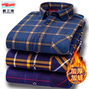 棉三錦純棉格子加絨加厚保暖襯衫男士冬季中年爸爸裝休閑磨毛襯衣