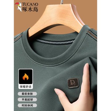 啄木鳥秋冬季男士長袖衛衣中年圓領T恤加絨加厚上衣保暖打底衫潮