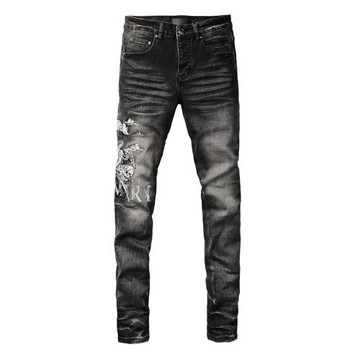 AMR jeans美式高街刺繡刮破修身長褲太一高街破洞緊身男牛仔褲子