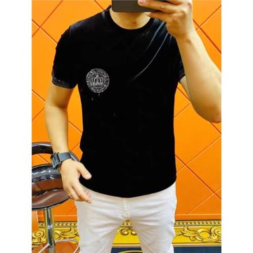 23208歐洲站秋季新款潮流韓版金絲絨燙鉆短袖T恤圓領時尚打底衫男