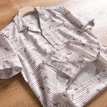 全棉色織細條紋短袖襯衫男日系復古夏季古著古巴領寬松半袖女上衣