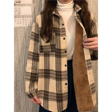 加絨加厚格子襯衫女秋冬歐貨小衫設計感復古小眾磨毛疊穿襯衣外套