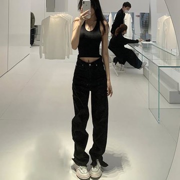 宋正恩黑色直筒牛仔褲女冬季寬松美式高街小個子慵懶闊腿拖地褲