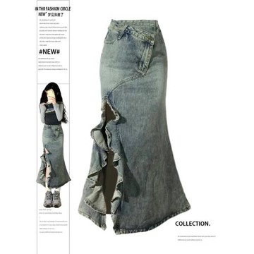 大碼2024新款復古不規則中長款牛仔半身裙女波浪開叉高腰魚尾裙子