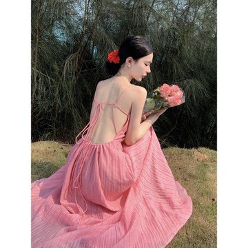 甜辣風大露背粉色吊帶連衣裙設計感小眾收腰沙灘裙女夏季海邊度假