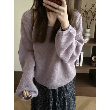紫色圓領套頭馬海毛毛衣女款2025新款秋冬季寬松慵懶風針織衫上衣