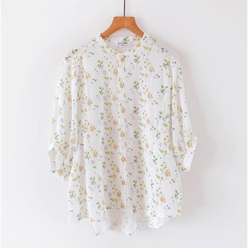 外貿大碼尾仿棉麻上衣女夏碎花白襯衫女中袖寬松休閑襯衣大碼女裝
