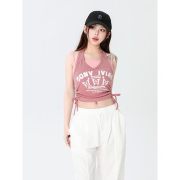 假兩件粉色掛脖小背心吊帶女夏季辣妹修身顯瘦抽繩褶皺無袖短上衣