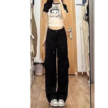 黑色工裝褲女秋季新款美式復古小個子抽繩低腰窄版直筒休閑褲子長