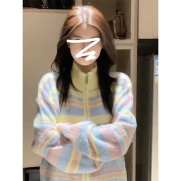 撞色條紋馬海毛毛衣女秋冬軟糯奶fufu寬松慵懶風高級感水貂絨上衣