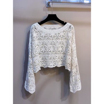 純棉罩衫女寬松慵懶風短款鏤空勾花長袖針織衫上衣春夏新款度假風