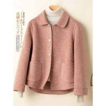 雙面絨毛呢大衣女秋冬小個子短款千鳥格寬松娃娃領羊毛西裝外套女