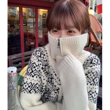 北歐復古費爾島提花高領拉鏈針織開衫女秋冬翻領軟糯加厚毛衣外套