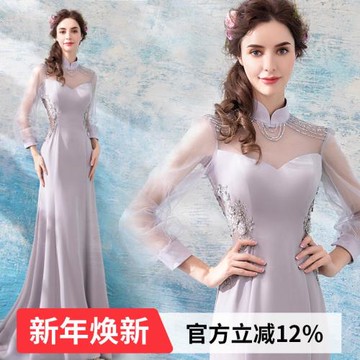 【天使嫁衣】灰色法式長袖晚宴年會表演演出主持人婚紗禮服 1098