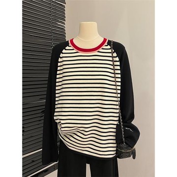 黑白條紋撞色圓領長袖T恤女秋冬內搭慵懶松弛感寬松顯瘦套頭上衣