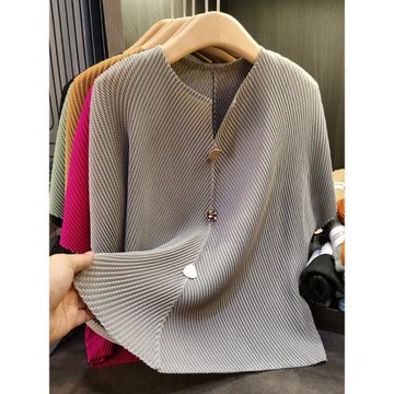 高級感紐扣裝飾龍鱗褶皺上衣百搭寬松顯瘦短袖T恤女夏季新款